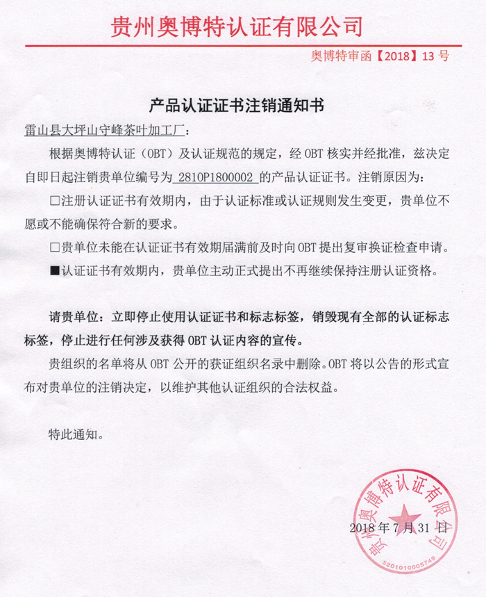 注銷雷山縣大坪山守峰茶葉加工廠產(chǎn)品認證證書通知