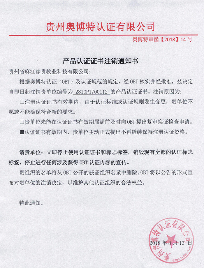 注銷貴州省麻江家貴牧業(yè)科技有限公司產(chǎn)品認(rèn)證證書通知