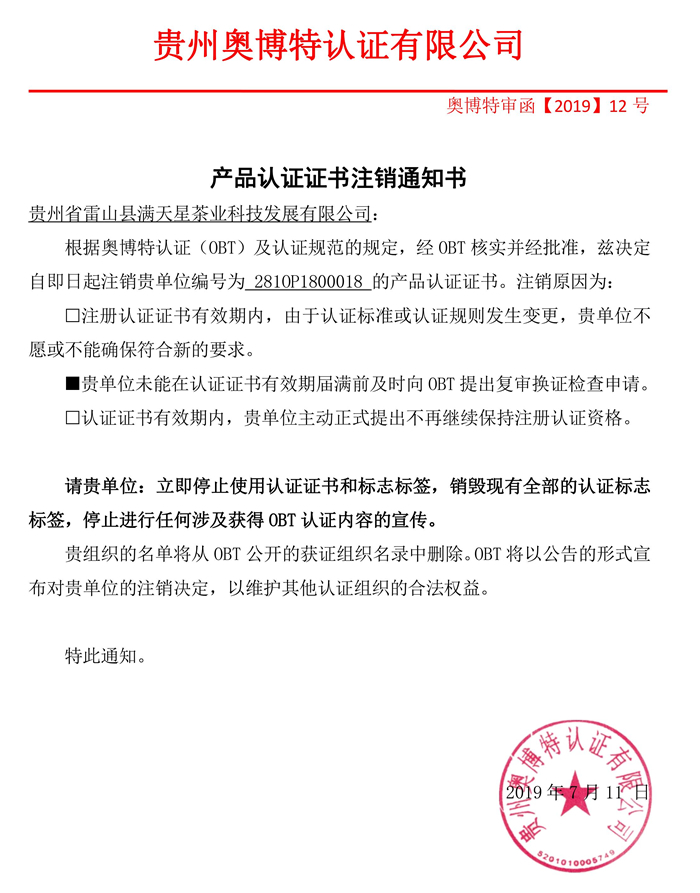 注銷貴州省雷山縣滿天星茶業(yè)科技發(fā)展有限公司產(chǎn)品認(rèn)證證書