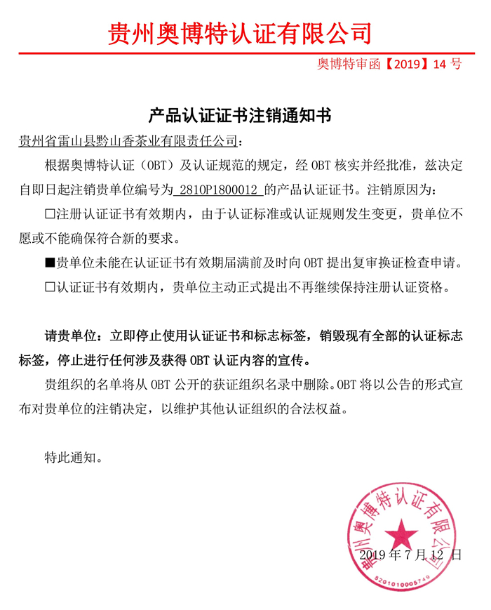 注銷貴州省雷山縣黔山香茶業有限責任公司產品認證證書通知