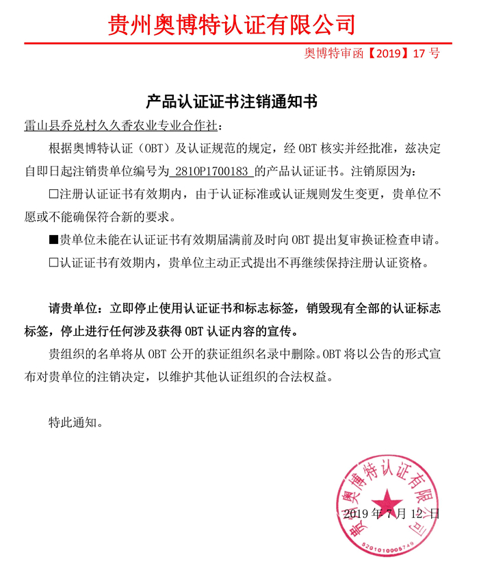 注銷雷山縣喬兌村久久香農(nóng)業(yè)專業(yè)合作社產(chǎn)品認證證書通知