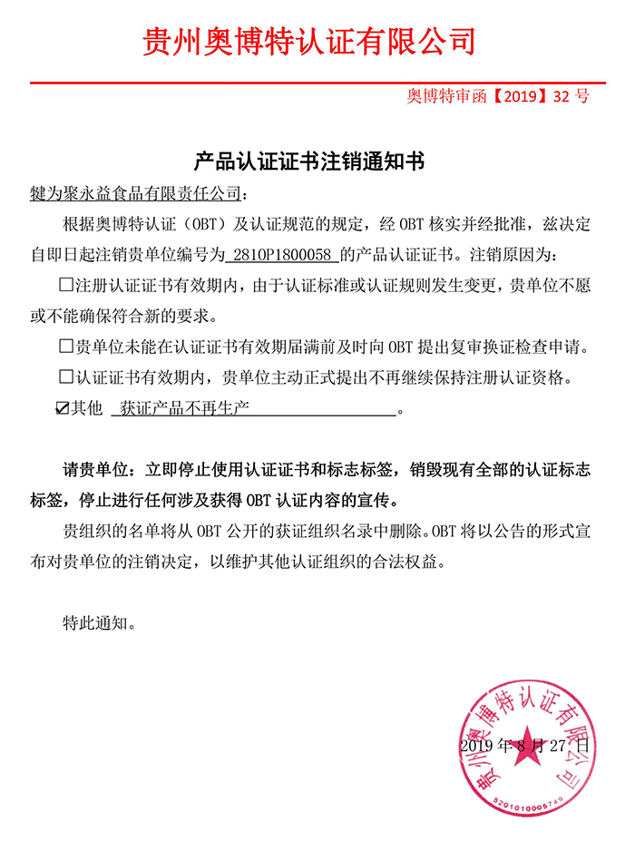 注銷犍為聚永益食品有限責任公司產品認證證書通知