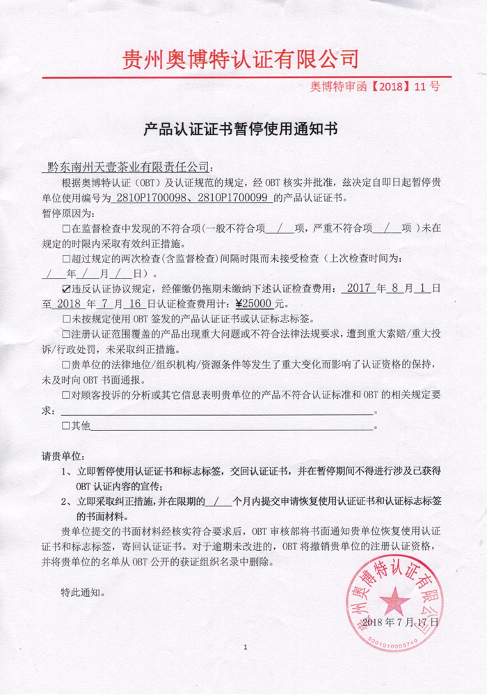 暫停黔東南州天壹茶業有限責任公司產品認證證書通知